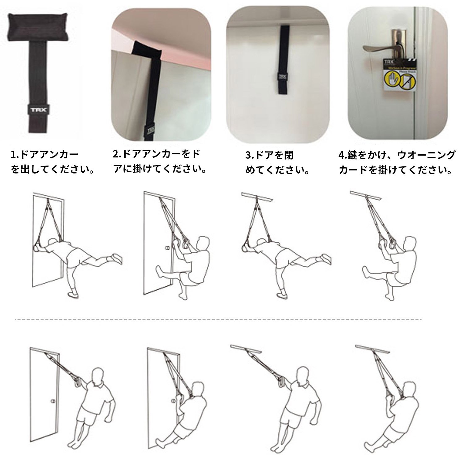 2, Close the door key, pull on the suspension trainer and make sure it is securely fixed to the door.