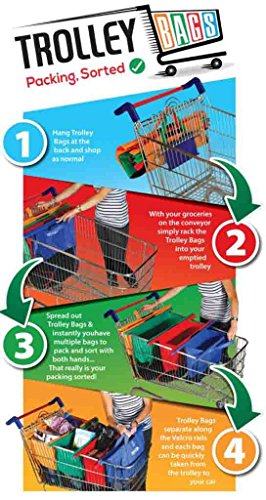 SMART DESIGN: Trolley Bags were designed with shopper’s ease in mind. They spread out perfectly when you are ready to use them. They attached via velcro for easy management and then easily separate to load into your car. Once you are finished you just fold them up and roll them up for easy storage