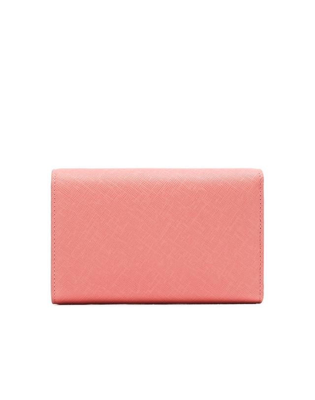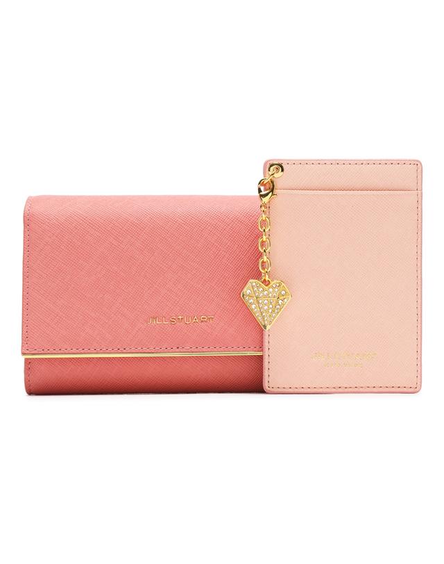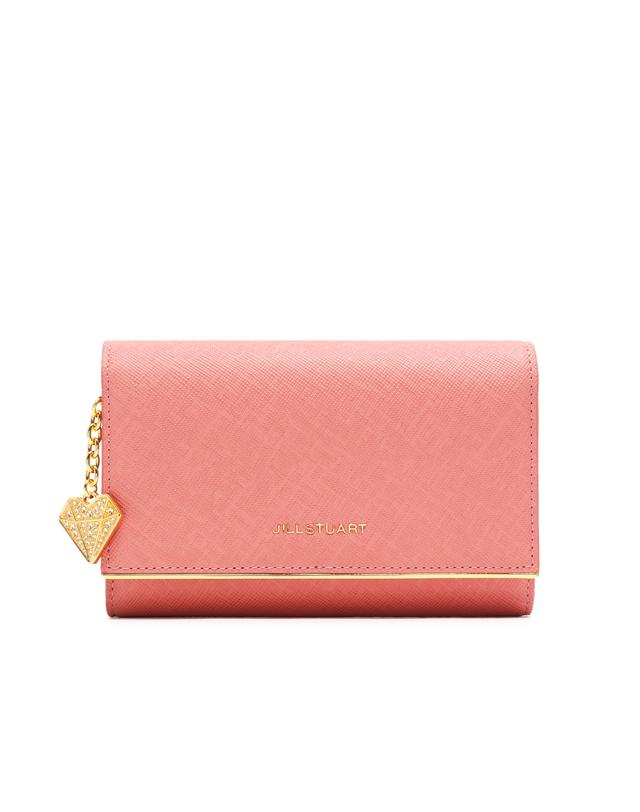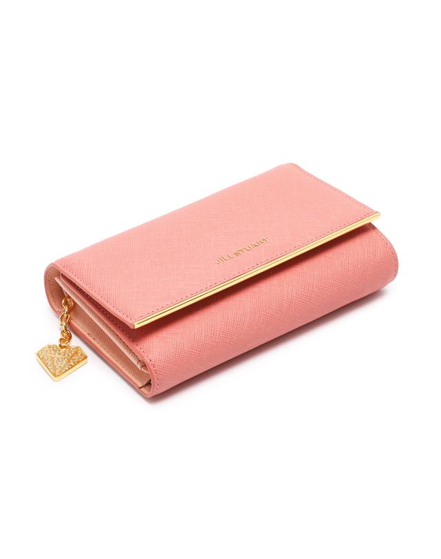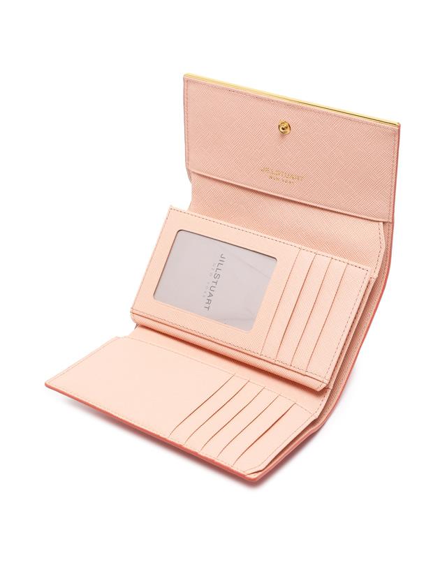 내부 베이비 핑크 배색으로 여성스럽고, 심플한 외관을 보여주며, 하단의 로고와 골드 바 장식으로 포인트를 준 3단 중지갑입니다.