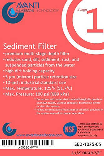 Stage 1 Sediment Filter for under-sink RO filtration drinking water system - NSF certified, 5 micron, 10 inch, 2.5" OD X 9-7/8" L (SED-1025-05X4), 4-Pack