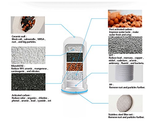 Filtering:Remove rust, sand, dirt and partially reduce chlorine, odor and heavy metals (including arsenic, lead, flouride, chrome, mercury);
