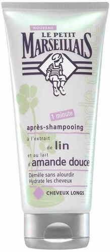 Le Petit Marseillais associated simple and effective ingredients to hydrate and disentangle your long hair, inspired of authentic Mediterranean receipts., Flax recognized for its soothing properties, Sweet almond oil, rich in vegetal lipids, brings its nutritive virtues., Creamy and consistent texture takes care and softness to your hair, without weighing down them. Nourished and hydrated, your hair finds softness, flexibility and brightness., Made in FranceFeature