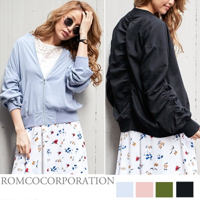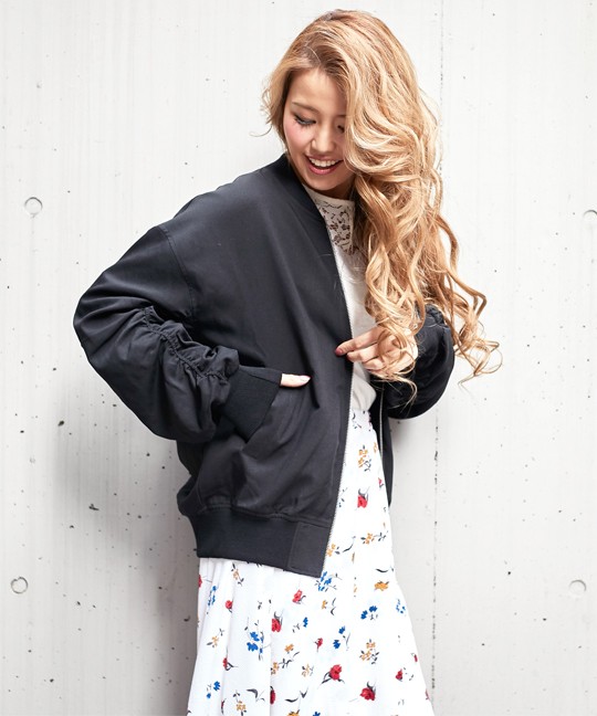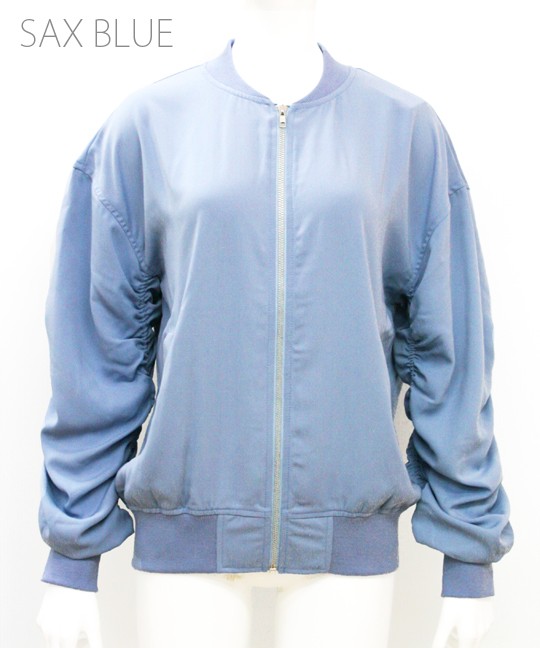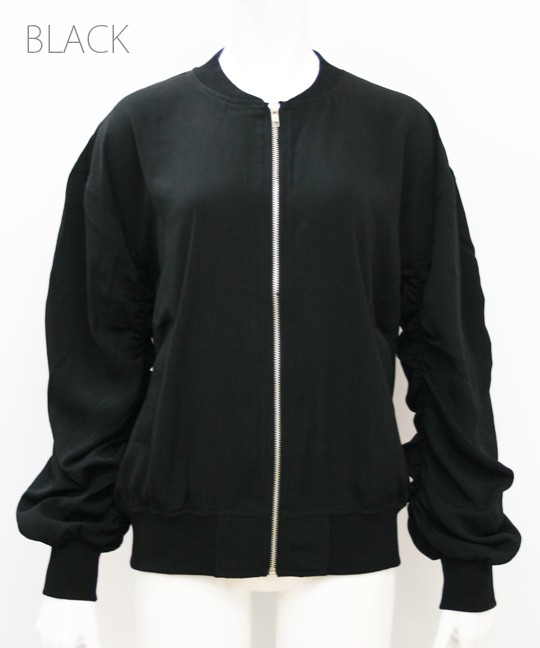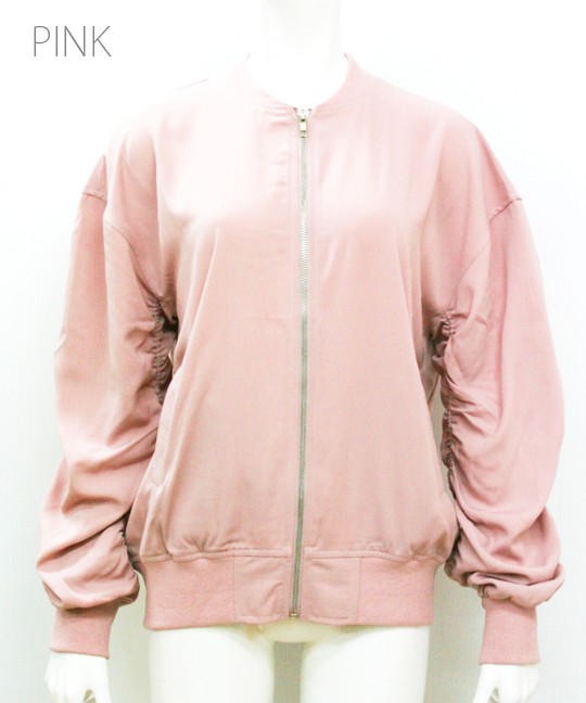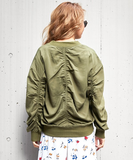 ルーズなシルエットのシャーリングブルゾン。<br>全体的にくしゅくしゅっとシャーリングを入れ、自然なボリューム感と女性らしい丸みのあるシルエットに!!<br>スキニー・ワイドパンツ・デニムなどどんなボトムとも相性抜群◎ <br>◆モデル 身長165cm<br><br>Mサイズ<br><br><br><br><br>
