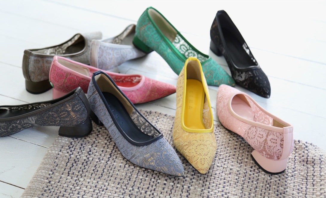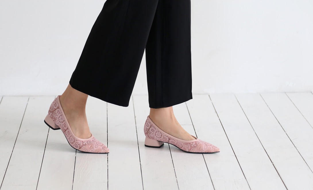 レディースファッションの婦人靴(レディースシューズ)の分野でパンプスは代表的なカテゴリー。スニーカー、ミュール、サンダルなど数かあるレディスファッションシューズの中でも最もスタンダードな種類で痛くないフラット(ぺたんこ)やピンヒール、ローヒール、オープントゥ、ストラップ、太ヒール、厚底、ポインテッドトゥ、バイカラー、リボン付きや、ひょう柄、メッシュなど種類や形状も多く存在し最も女性らしさを引き立て世界で多くの女性に愛されています。