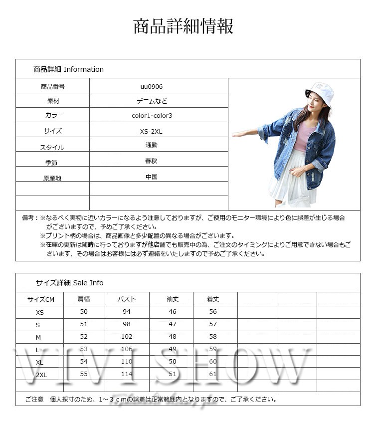 ■素材:デニムなど■カラー:color1 color2 color3 ■サイズ:XSバスト94袖丈46着丈56肩幅50Sバスト98袖丈47着丈57肩幅51Mバスト102袖丈48着丈58肩幅52Lバスト106袖丈49着丈59肩幅53XLバスト110袖丈50着丈60肩幅542XLバスト114袖丈51着丈61肩幅55■原産地:中国