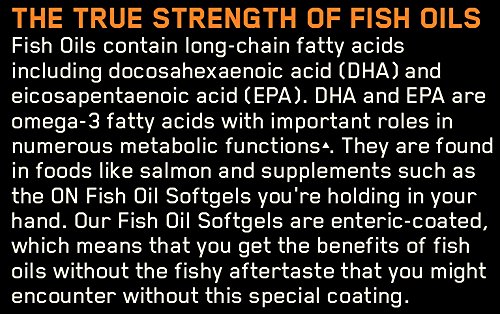 Fish Oils contain long-chain fatty acids, with equally long names like docosahexenoic acid (DHA) and eicosapentaenoic acid (EPA). DHA and EPA are essential fats that cannot be made by your body. So, consuming them through foods like salmon and supplements such as the ON Fish Oil Softgels is the only way to get DHA and EPA. Better yet, our Fish Oil Softgels are enteric coated, which means that you get all of the benefits of fish oils without the fishy aftertaste that you might encounter without this special coating.Feature
