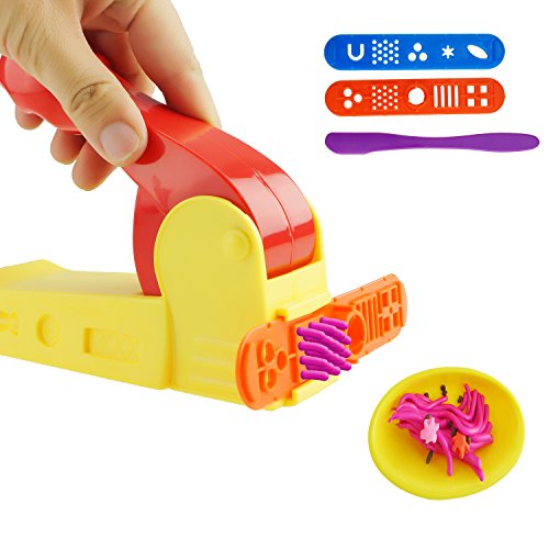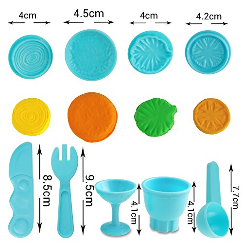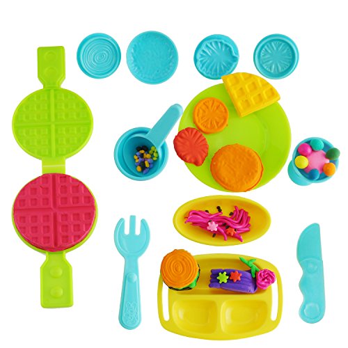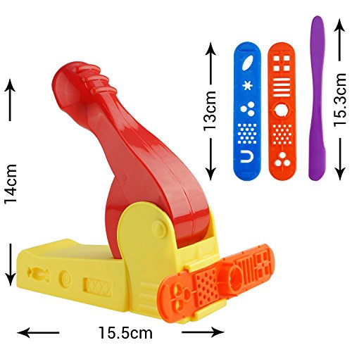 Dough Tools Kit: 23 pieces in one set (Extruder Machine, Extruder Tools, Plastic Silverware, Molds (Waffle, Tomatoe, onion, lettuce, Bun), Dough Tools). All of them are assorted color.