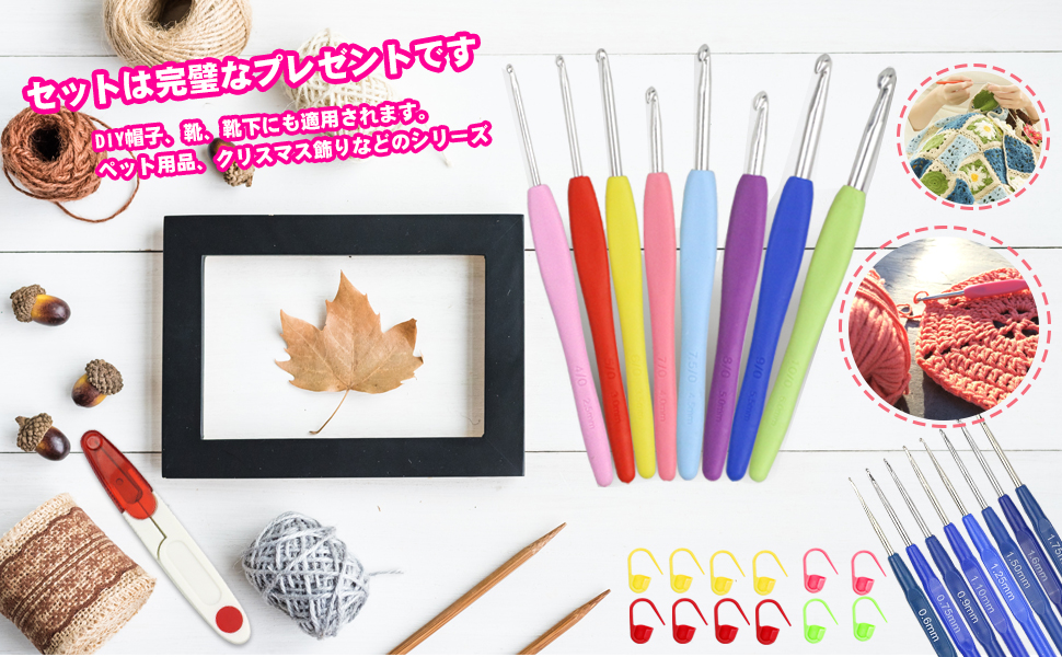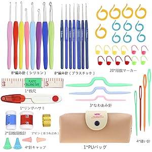 【セット内容】16*編み針、20*段数マーカー、1*巻尺、1*リングハサミ、4*針キャップ、2*目数段数計、1*ピン、4*縫い針、3*なわあみ針、1*PUバッグ