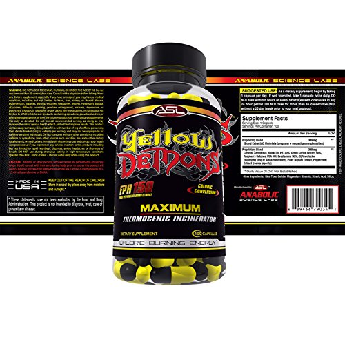 -. Binding : Health and Beauty -. Brand : YELLOW DEMONS EPH 150 -. EAN : 0689466790344 -. Feature : FAT BURNING AND ENERGY SUPPLEMENT AND THERMOGENIC which may help burn fat while exercising. / FORMULATED TO BE A TOP RATED fat burner and hunger suppressant for both men and women. / CONTROL APPETITE and may help you lose weight while eating sensibly and exercising. / THREE WEIGHT LOSS PRODUCTS IN ONE - No need to purchase different weight loss supplements. / PREMIUM INGREDIENTS formulated to help with losing belly fat and boosting energy during workouts. -. IsAdultProduct : 0 -. Label : Anabolic Science Labs -. LegalDisclaimer : The statements on this page have not been evaluated by the FDA. This product is not intended to diagnose, treat, cure, or prevent any disease. -. Manufacturer : Anabolic Science Labs -. MPN : YELLOWDEMON150EPH -. PackageQuantity : 1 -. PartNumber : YELLOWDEMON150EPH -. ProductGroup : Health and Beauty -. ProductTypeName : HEALTH_PERSONAL_CARE -. Publisher : Anabolic Science Labs -. Studio : Anabolic Science Labs -. Title : Thermogenic Fat Burner for Men and Women YELLOW DEMONS by Anabolic Science Labs, Best 100% Complete All In One Appetite Suppressant, Clean Energy, Weight Loss, Fat Cutter and Thermogenic Supplement -. UPC : 689466790344