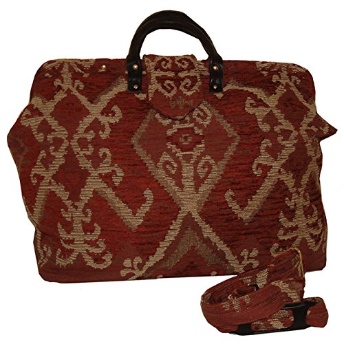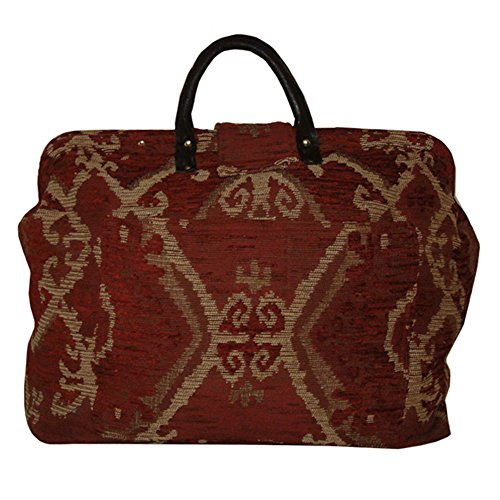 -. Brand : FlyingNeedleGallery -. Color : Brick Red -. Department : unisex-adult -. Feature : Soft-sided bag handcrafted from chenille tapestry, fully lined, soft glove leather handles / Spring loaded frame with magnetic tab closure, matching detachable shoulder strap, 4 inside pockets / Measures 18" x 16" x 7", back outside pocket holds plane tickets, tablet, books, etc / Lightweight board between fabric layers provides stability; 6 brass feet on bottom protect fabric / The perfect carry on or weekend bag - can be molded to fit into overhead bin or under seat -. Model : CB069 -. ProductGroup : Apparel -. ProductTypeName : LAGE -. Title : FlyingNeedleGallery's Tan & Brick Red Kilim Chenille Carpet Bag