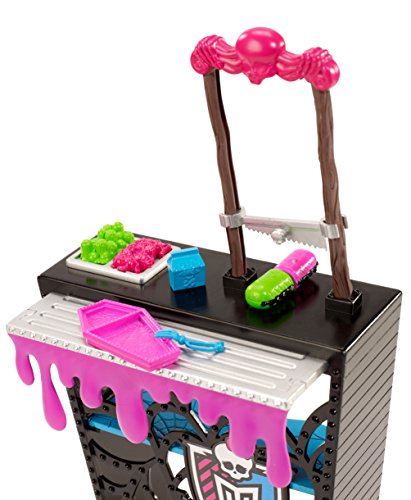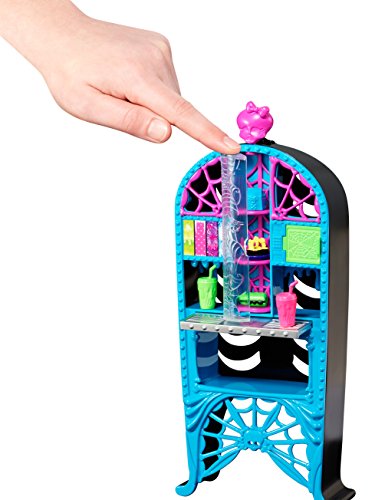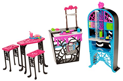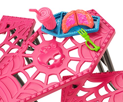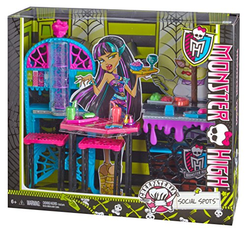 Monster High is filled with creepy cool places to fang out when not in class. This Creepateria set lets girls play out favorite scenes from the webisodes! Ready for all the ghouls' die-ning needs (dolls sold separately), this creepy environment features monsterrific play spaces and pieces. Fill a monster appetite with an order from the food counter - with its working guillotine sandwich slicer. The ghouls (dolls sold separately) can use it to "slice" the two sandwich halves. Grab a ghoul a tray for the die-licious food and make sure to grab a drink - or "heat" something up - at the Skullette-decorated microwave/drink station. A shelf pulls out and the doors (one on the microwave and one for vending-like storage) open and close. Two seats are available at the coffin-shaped Creepateria table. Place a ghoul on a seat to "devour" the meal. Lunch-themed accessories include two coffin-shaped food trays, ghoulish monster drinks, creepy cool foods, two drink cups and two forks. Spooktacular accents, like web details, dripping decals and Skullette figures, are iconic. Collect dolls and other school accessories (sold separately) to expand the play to Monster High proportions! Includes food counter with working guillotine, microwave/drink station, table, two stools and lunch-themed accessories; dolls not included. Ages 6 and older.Feature