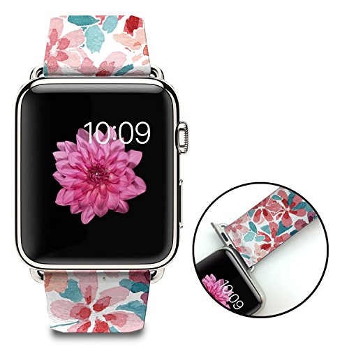 Apple Watch Band, 38mm Genuine Leather Strap Wrist Band Replacement with Metal Clasp for Apple Watch All Models 38mm iWatch Strap (Watercolor Floral-P69)