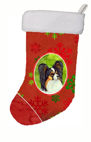 Caroline's Treasures Papillon Red and Green Snowflakes Holiday Christmas Stocking, 11 x 18", Multicolor