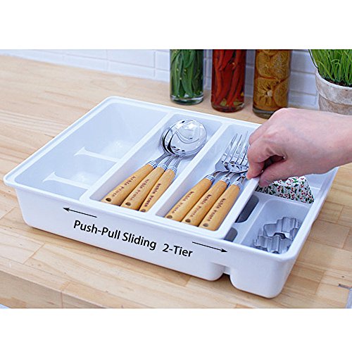 Romote Kitchen Drawer Dividers Cutlery Tray,Sliding 2-Tier Plastic Drawer Organizer for Utensils