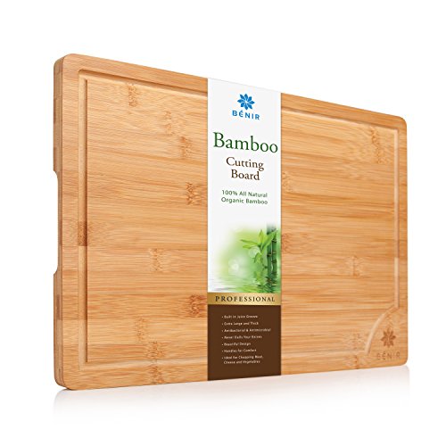 - THE MOST GORGEOUS, DENSE GRAIN BAMBOO BOARD – CHEF APPROVED WOODEN CUTTING BOARD PERFECT for ENTERTAINING: Crafted from the finest Organic Bamboo, with an impressive 18x12x0.8 inches size, you can easily slide a large roast onto this cutting board with built-in side grooves, capturing all of the delicious au jus; then wash it in seconds, flip it over and use it like a cheese board set, creating an elegant presentation for everything from crudité to sushi to whatever your imagination can dream up