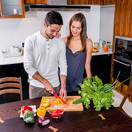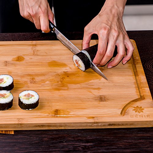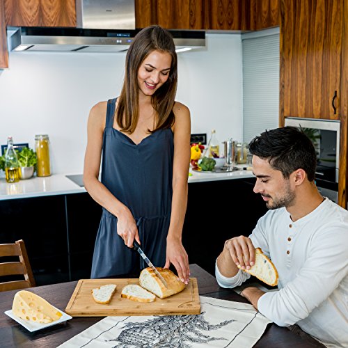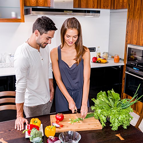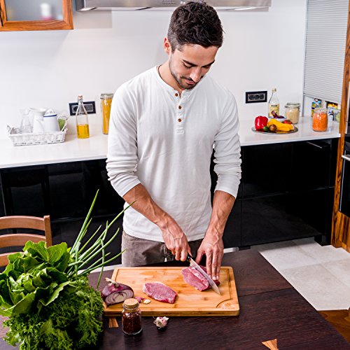 - METICULOUSLY CHOSEN for CHARACTER & DURABILITY – WON’T WARP, CHIP, SPLINTER or CRACK: We know you’re making more than a smart one-time purchase; you’re making an investment into your kitchen and lifestyle – so we use only 100% solid, premium quality bamboo and METICULOUSLY INSPECT the wood for potential flaws BEFORE it makes it into our craftsmen’s hands – guaranteeing this LOW MAINTENANCE bamboo board it won’t warp, chip or crack.