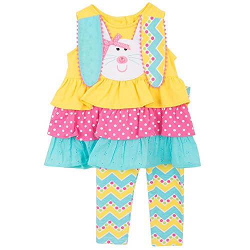-. Binding : Apparel -. Brand : Rare Editions -. Color : Multi -. Department : baby-girls -. Feature : Pink, yellow and turquoise tiered top / Large bunny applique with floppy ears / Matching patterned leggings / Great for first Easter or spring wear -. ProductGroup : Apparel -. ProductTypeName : PANTS -. Title : Rare Editions Baby Girl Spring First Easter Bunny Set (3m-24m)