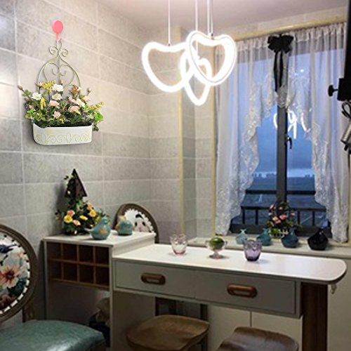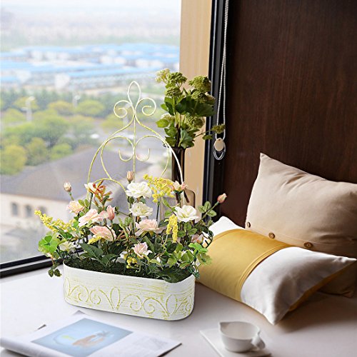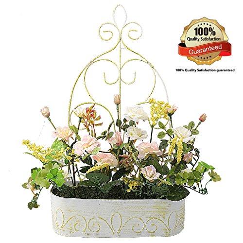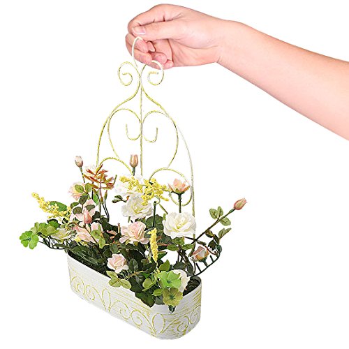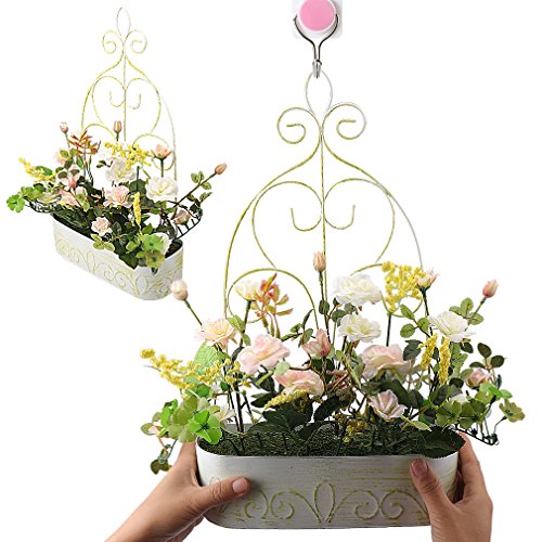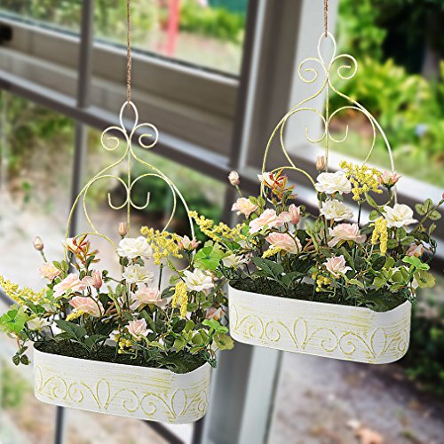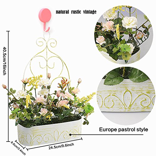 RERXN Europern Pastrol Artificial Flower in Iron Basket Silk Rose with Hanging Rack Indoor Outdoor Home Wedding Decor (White)