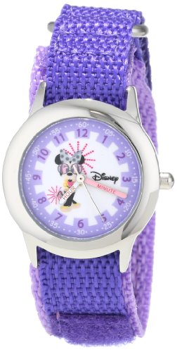 -. Binding : Watch -. Brand : Disney -. Color : Silver/Steel -. Department : girls -. EAN : 0843231063624 -. Feature : Round Time Teacher Stainless Steel Watch with Disney's Minnie Mouse character on dial. / Meets or exceeds all US Govt requirements and regulations for Children's watches. / Recommended for Ages 3-7 years old. Includes a Time Teacher Punch Out clock for Parents to Teach their Children. / Accurate Japanese Quartz movement, scratch resistant mineral crystal, Hook and Loop Nylon strap. / Water Resistant to 99 feet: withstands rain and splashes of water, but not showering or submersion. / 1 Year Limited Manufacturers Warranty -. Label : Disney -. Manufacturer : Disney -. Model : W000363 -. MPN : W000363 -. NumberOfItems : 1 -. PackageQuantity : 1 -. PartNumber : W000363 -. ProductGroup : Watch -. ProductTypeName : WATCH -. Publisher : Disney -. ReleaseDate : 2012-10-01 -. Studio : Disney -. Title : Disney Kids' W000363 Minnie Mouse Stainless Steel Time Teacher Purple Nylon Strap Watch -. UPC : 843231063624