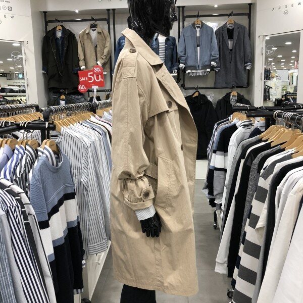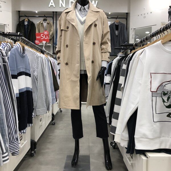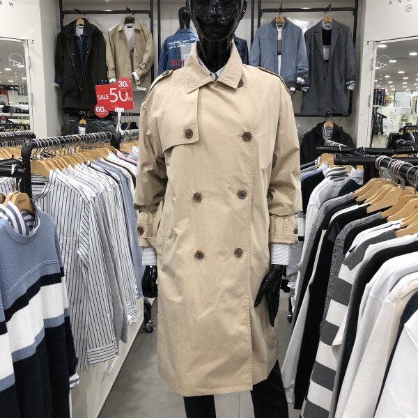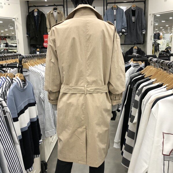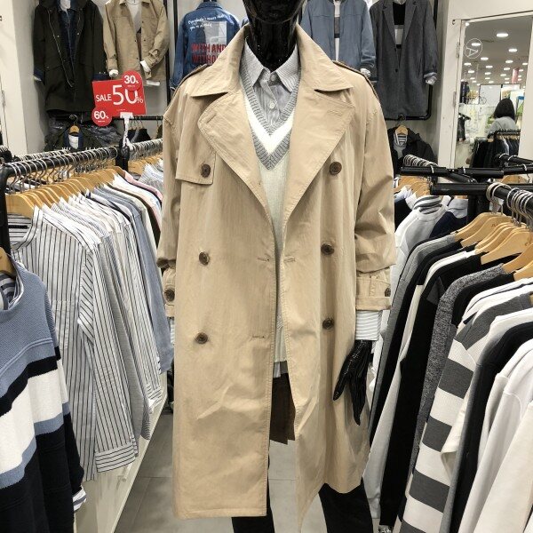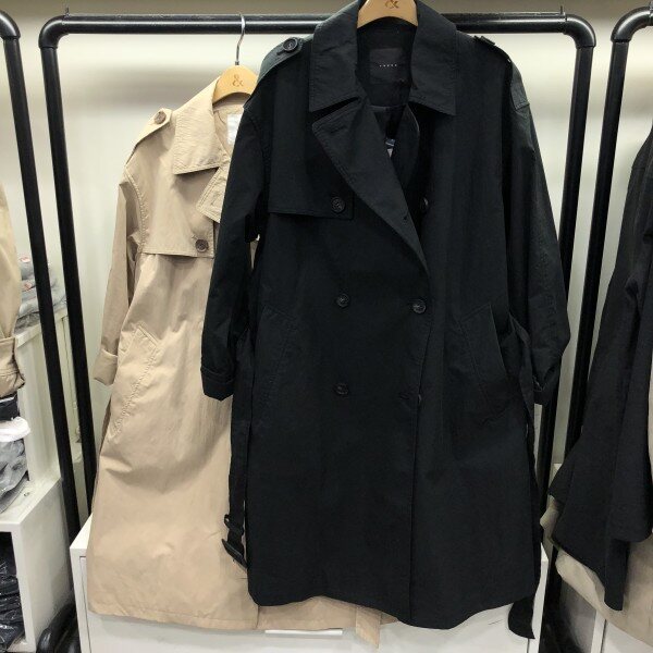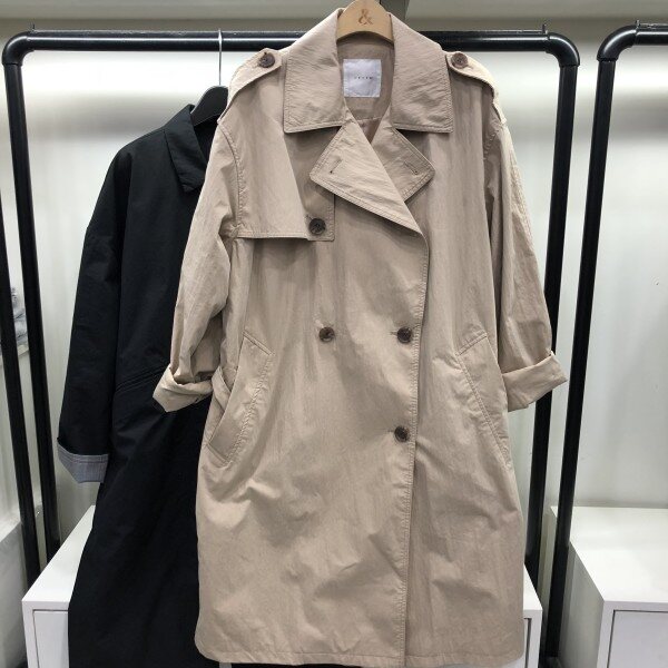 여성용 트렌치 코트 제품입니다. 군더더기 없이 깔끔한 디자인으로 투버튼 타입으로 나왔으며 어깨선이 내려와있으며 전체적으로 품이 여유있게 나온 오버핏 스타일의 제품입니다. 무릎 살짝 위로 올라오는 적당한 길이감과 가벼운 원단으로 착용감이 굉장히 좋은 제품입니다.