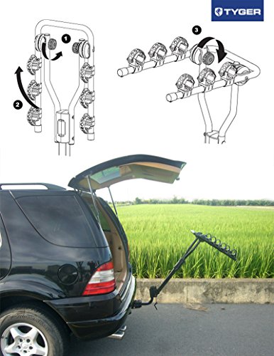 - Feature : Fits all types of dual-arm bikes on vehicles equipped with either a 1.25 or a 2 inch hitch receiver. (If your vehicle has spare tire installed on tailgate, like Jeep Wrangler & Toyota Rav4, a hitch extension may be needed.) / 3 bike capacity with sturdy and handy construction. Receiver lock & security strap included. OE standard Black color E-Coating for rust resistance. / Convenient vehicle access with tilt down feature and foldable carry arms when not in use. Soft cradles made to protect your bike frame and secure your bikes individually. / Easy installation in minutes. (DIY instruction included in package.) / TYGER No-Hassle Limited Lifetime Warranty!