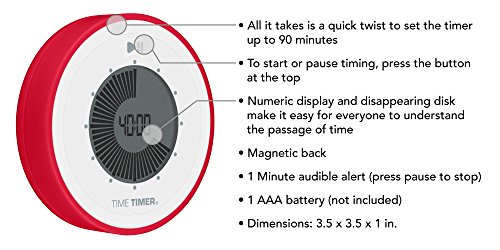 The Time Timer TWIST has no loud ticking and is a digital version of the Time Timer. Simply set the TWIST by turning the outer ring until you get to your desired time (up to 90 minutes), then press the play/pause button. A digital display shows at a glance how much time remains, and an alert lets you know when time is up. A magnetic back makes the portable TWIST a snap to display and move from place to place. Easily attach it to most metallic surfaces from refrigerators and file cabinets to the whiteboard in your classroom. The TWIST is a versatile personal timer that helps make all kinds of everyday tasks easier and more productive. - At home use the TWIST in the kitchen, the office, or your workout room to keep you on task.