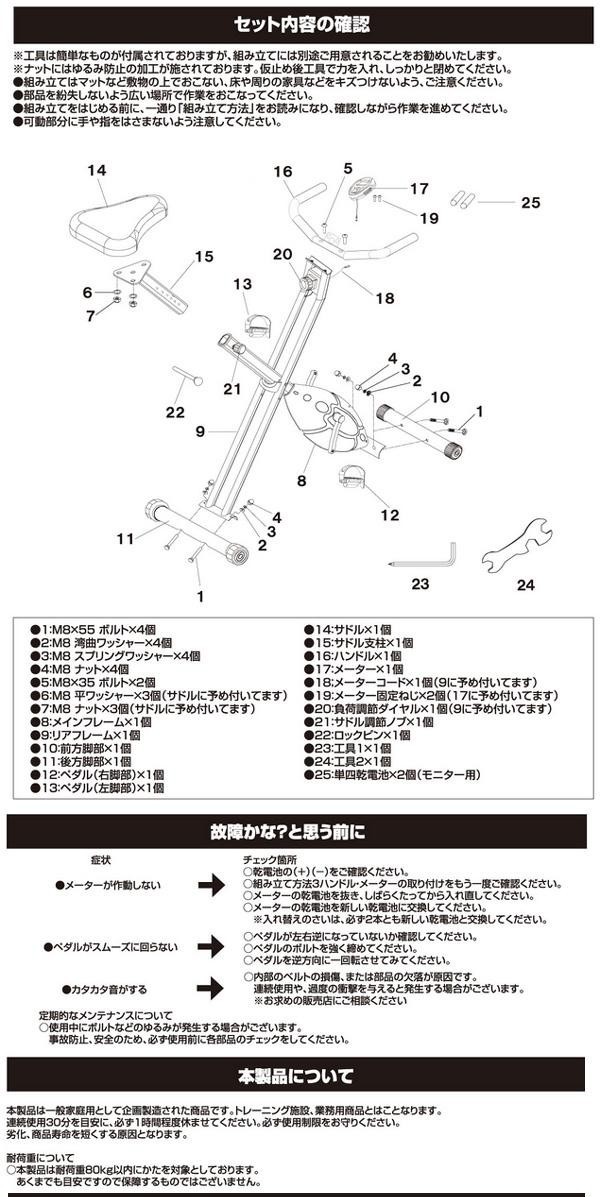 | 仕様 | ●組立式 ●マグネット式 ●サドル高さ6段階調節可(約750・770・790・810・830・850mm) ●メーター機能:スピード・時間・距離・累積距離・消費カロリー・スキャン ●耐荷重:80kg ●単4乾電池×2(モニター用テスト電池付属) ●簡易工具・取扱説明書付 |