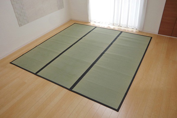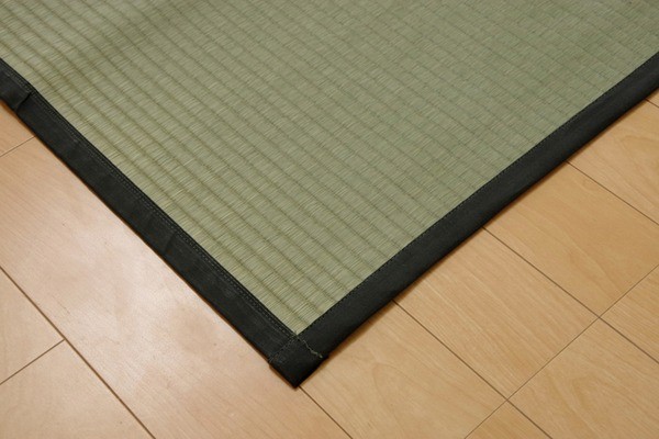 またイ草は使用するうちに日焼けをしますが、真中の青の部分を多く使用したものほど、全体が綺麗にムラなく日焼けし、味が出ます。こちらの商品は畳表と同じ織り方の糸引織で仕上げました。双目織りと比べて、い草の打ち込み本数が多いため丈夫です。表面が滑らかなので、ホコリなどがたまりにくいのが特徴です。長くご使用されたい方や、耐久性をお求めの方には糸引織をおすすめします。