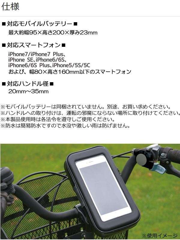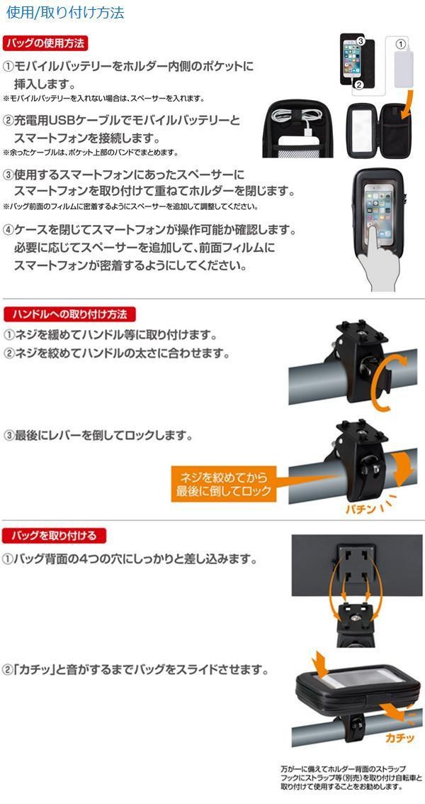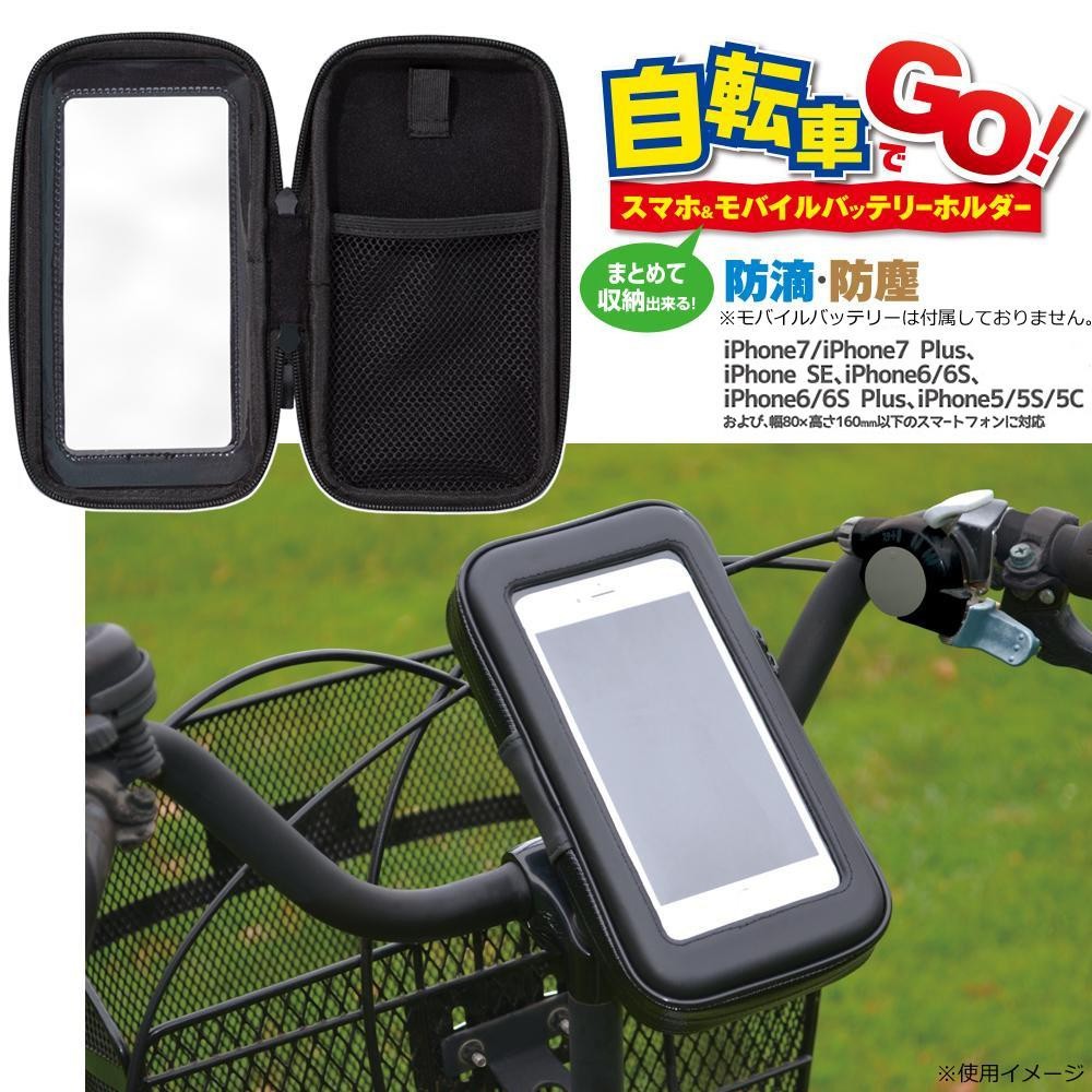 | スマートフォンを簡単に自転車等に取り付けできる防滴・防塵対応のホルダーです。モバイルバッテリーも一緒に入れられる大きめサイズ。充電しながらスマートフォンを使う事も可能なので、バッテリーを多く使用するナビゲーションアプリやGPSを利用したアプリとの同時使用に最適です。 |