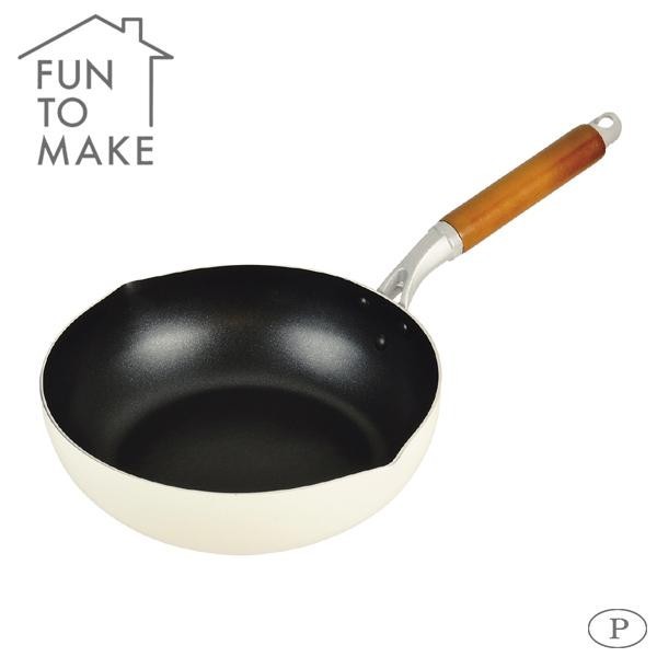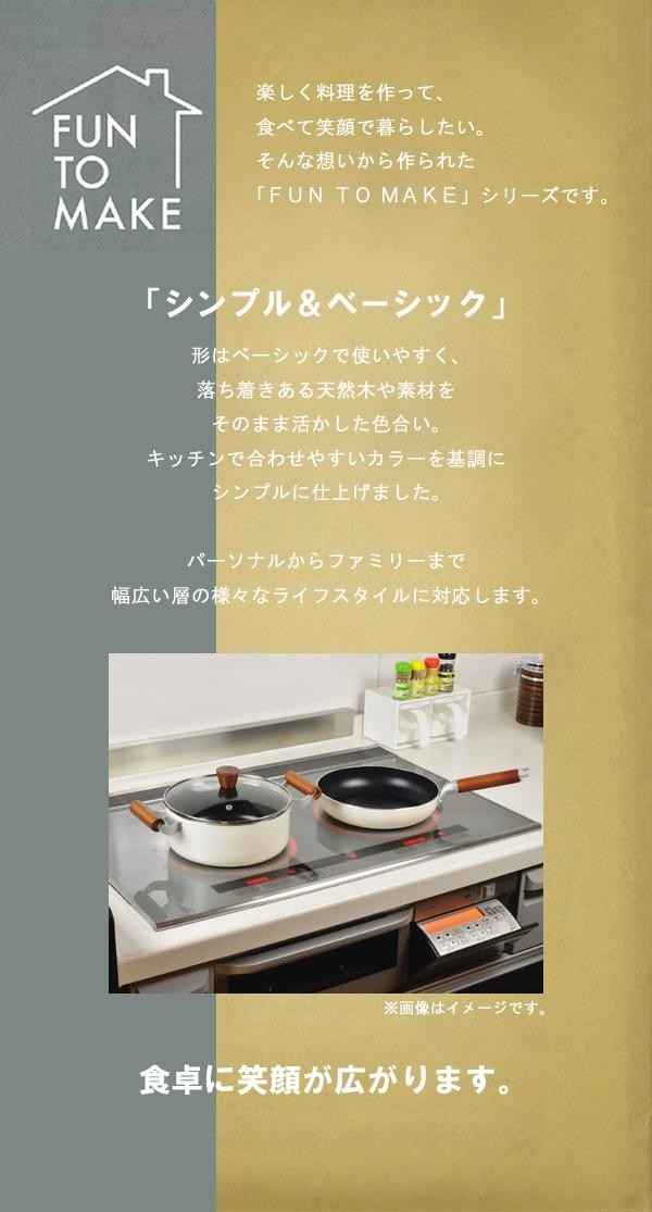 | 形はベーシックで使いやすく、落ち着きある天然木や素材をそのまま活かした色合いで、キッチンに合わせやすい深型フライパンです。 |