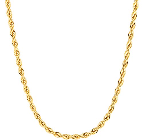 Why? We use REAL 24 K GOLD over semi-precious metals (10 X more than usual plating). Designed with the look and feel of solid gold we offer it at a fraction of the cost. We solder the ends and use superior lobster clasps for strength. No more fiddling with clasps that break! Our 3mm Rope Chains come in sizes 16"-30". Other sizes available on request.