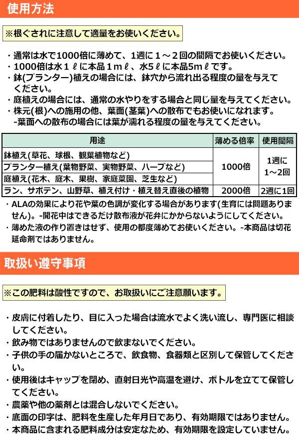 ALA(5-アミノレブリン酸)を配合した本格派ガーデナー向けの液体肥料。有機肥料との併用がおすすめです。 |