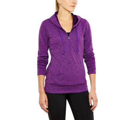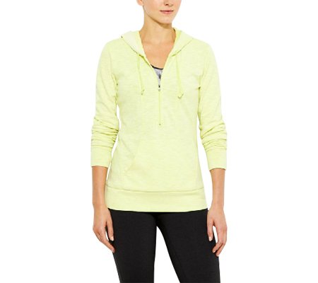 Heathered-knit hooded pullover with half zip featuring chafe-free flatlock seaming and kangaroo pocket