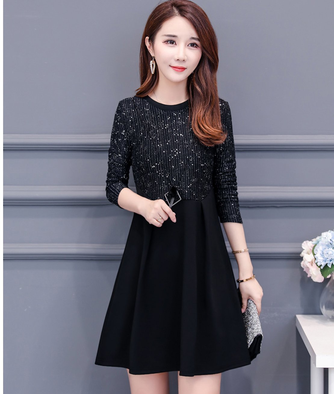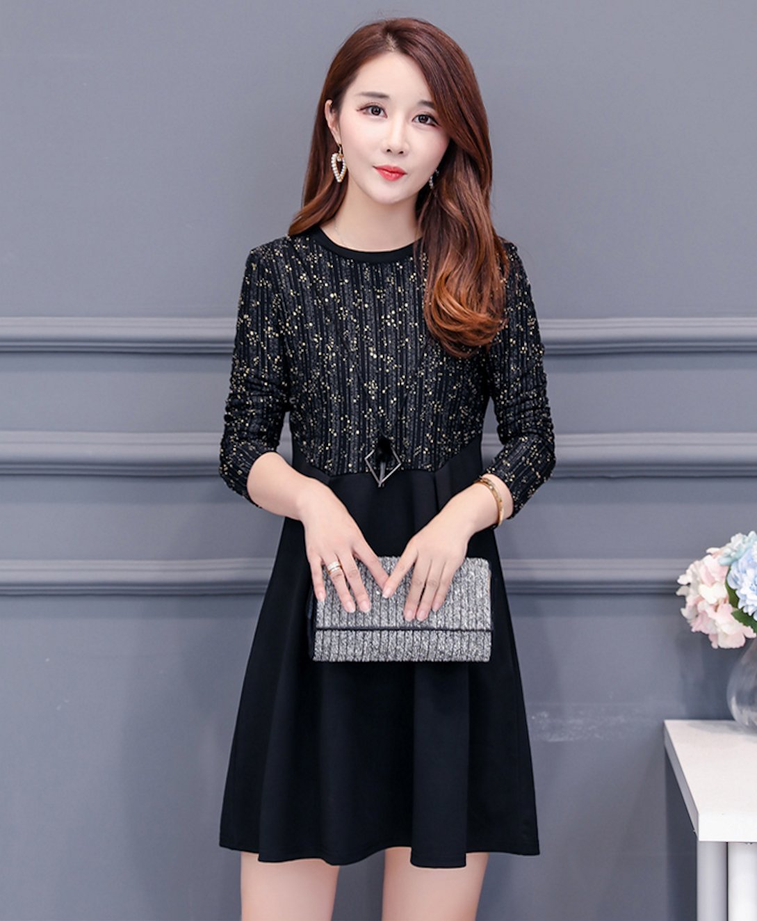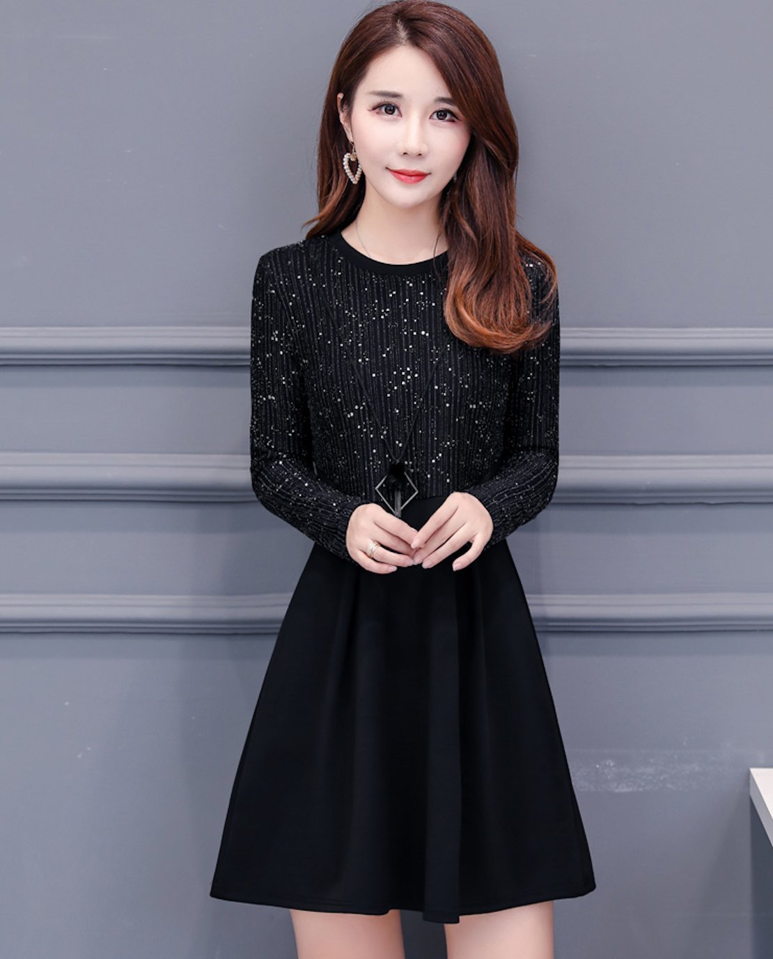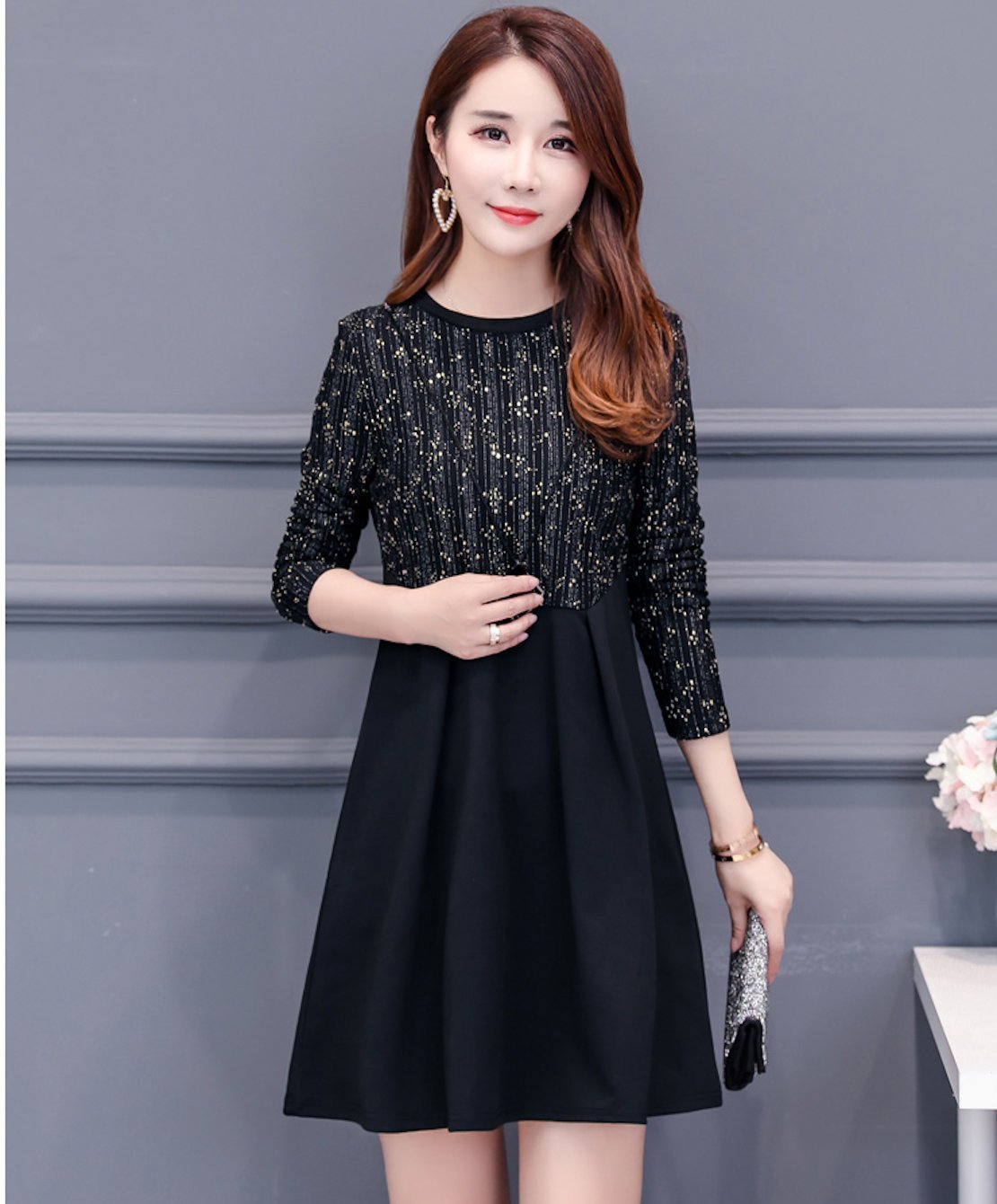 ラウンドネック ワンピース ラメ 異素材 裏起毛 ミニ丈 ドレス お呼ばれコーデ 大きいサイズ クルーネック ラウンドネック 切替 結婚式