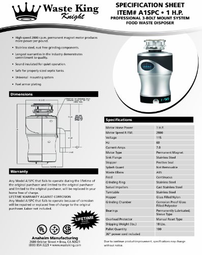 Waste King 1.0 Horsepower Garbage Disposal with Exclusive Silencer Technology, A1SPC Knight