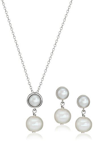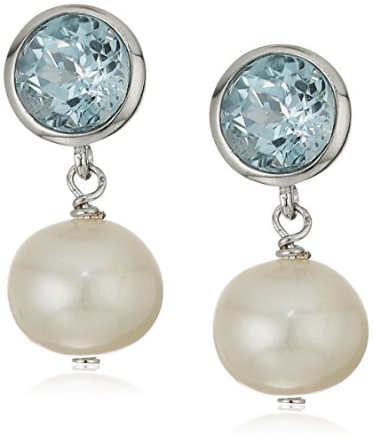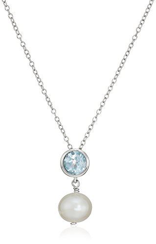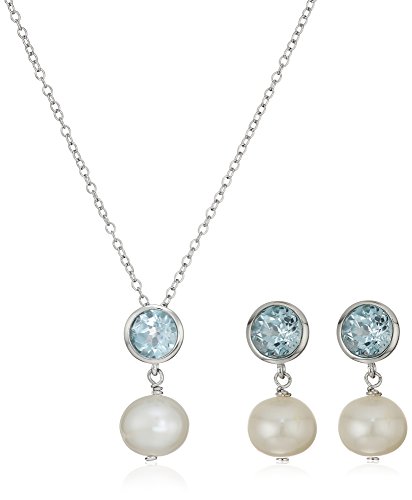 Sterling Silver Genuine Blue Topaz 6mm and Genuine Pearl 8-9mm Bezel Set Stud Earrings and Pendant Necklace Jewelry Set