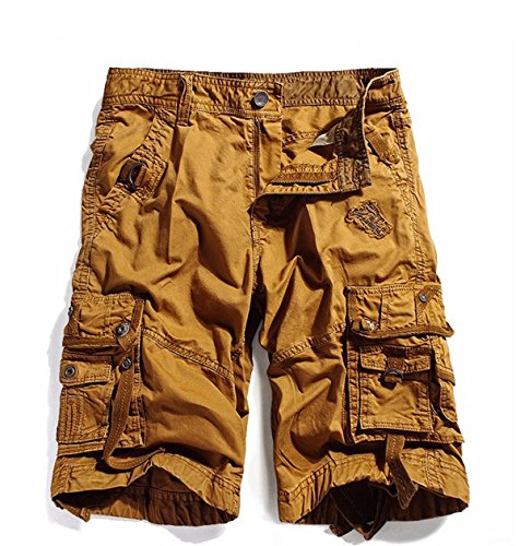 -. Feature : Fabric: Solid cotton, 80% Cotton and 20% Polyester / Multiple pockets including side hand-pockets, plus rear and leg cargo pockets with snaps. / Loose camouflage cargo shorts (Notice: no belt) / ***Please note: We provide detailed size information below, please check it before purchase. Body builds vary by person, and you may need buy one size up.*** / Shorts are made of lightweight, comfortable, and breathable material which are ideal for summer wear, pockets are stylish yet functional, perfect for everyday wear or even work attire if shorts are an option.