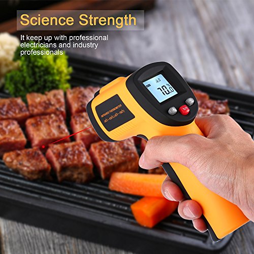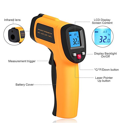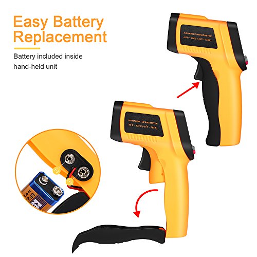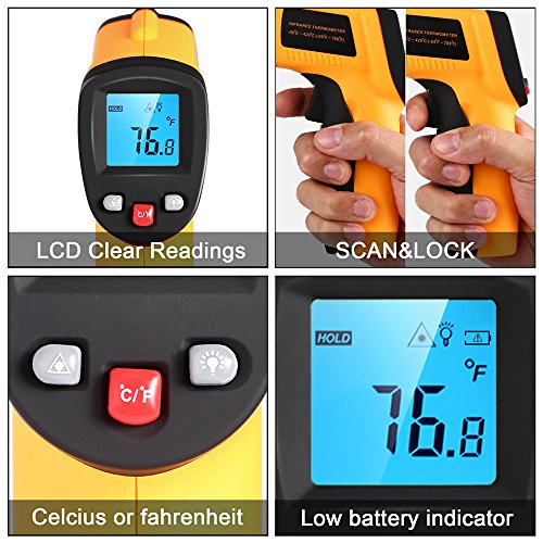 【Homgrace Infrared Thermometer】 Homgrace specialize in some tools product, our this Infrared thermometer practical for both indoor and outdoor use. Meet All Your Temperature Test Demand, Perfect for home cooking,barbequing, performing auto maintenance and a host of other affairs. 【Higher Accuracy】 Homgrace thermometer gun measure extreme temperatures ranging from -58°F (-50°C) to 716°F (380°C) without ever needing to come in contact. you can effortlessly switch between Fahrenheit and Celsius without ever needing to remeasure. 【Multi-Function】 Backlit LCD screen,Auto Shut-off Data Hold Function Low Battery Indicator Backlight Display Selection