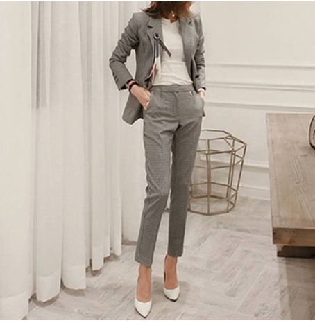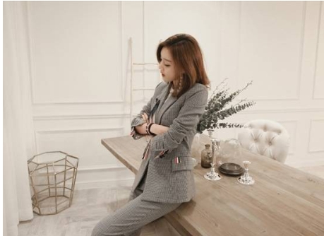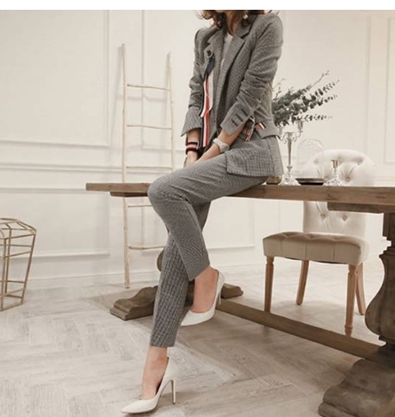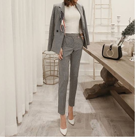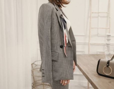 トラディショナルな印象の、グレーベースのチェック柄パンツスーツです。