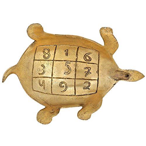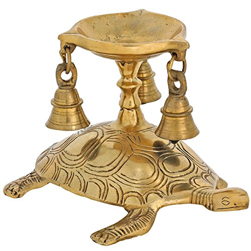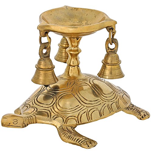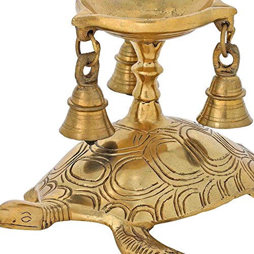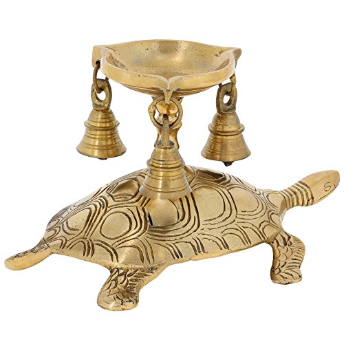 Hindu Diya Lamp and Bells Atop Turtle Brass Metal Sculpture Figurine