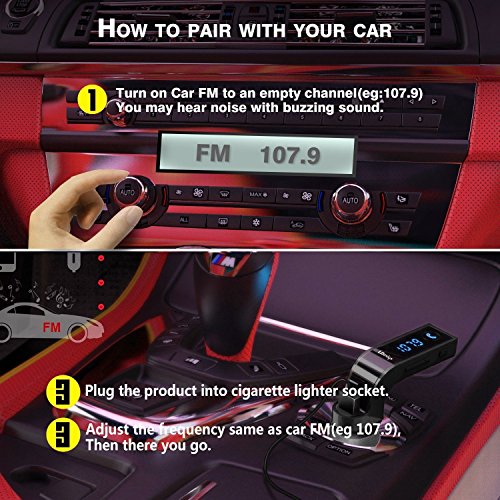 【4 Modes Play Music,Fast Adjust Station】: Play music via USB Flash Drive and TF Card with MP3 file,with the 3.5MM aux cable,search ''G7'' bluetooth in your device and connect.built-in microphone with (CVC) technology. At first, plug it into car. you should choose a blank channel and it will makes a whisper.Then, you set the device to the same channel(87.5~108MHz). you should click the "CH" button, use the "+" or "-" to adjust the station in 3~4 seconds,the LED will light