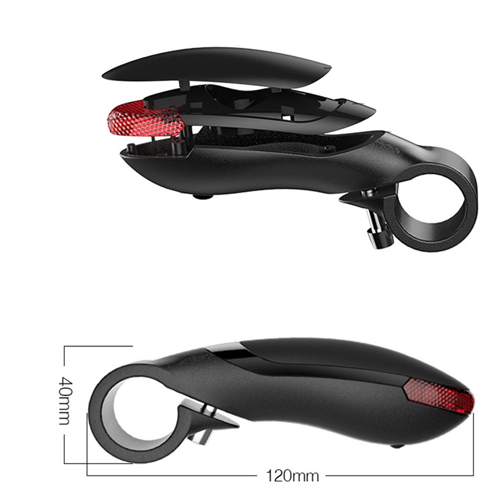 ● Material: Aluminum Alloy Size: 120 * 40mm Weight: Approx 160g ● Waterproof: IPX-5 Life Waterproof Battery: CR2023 Button Battery * 2 (Replaceable) Corresponding Saddle Diameter: 22.2mm ● Power Button Press to Turn on 3 Power Mode:
