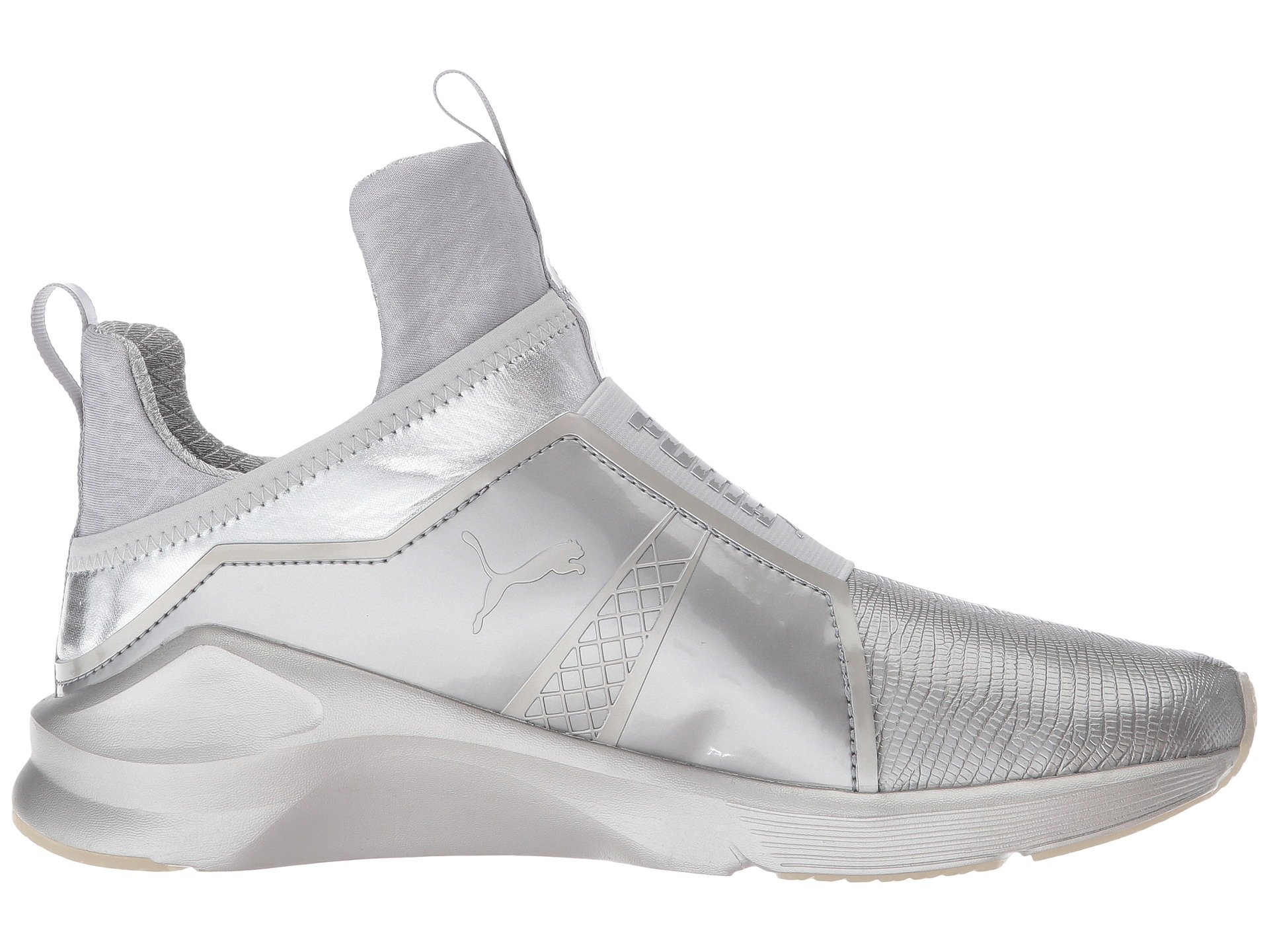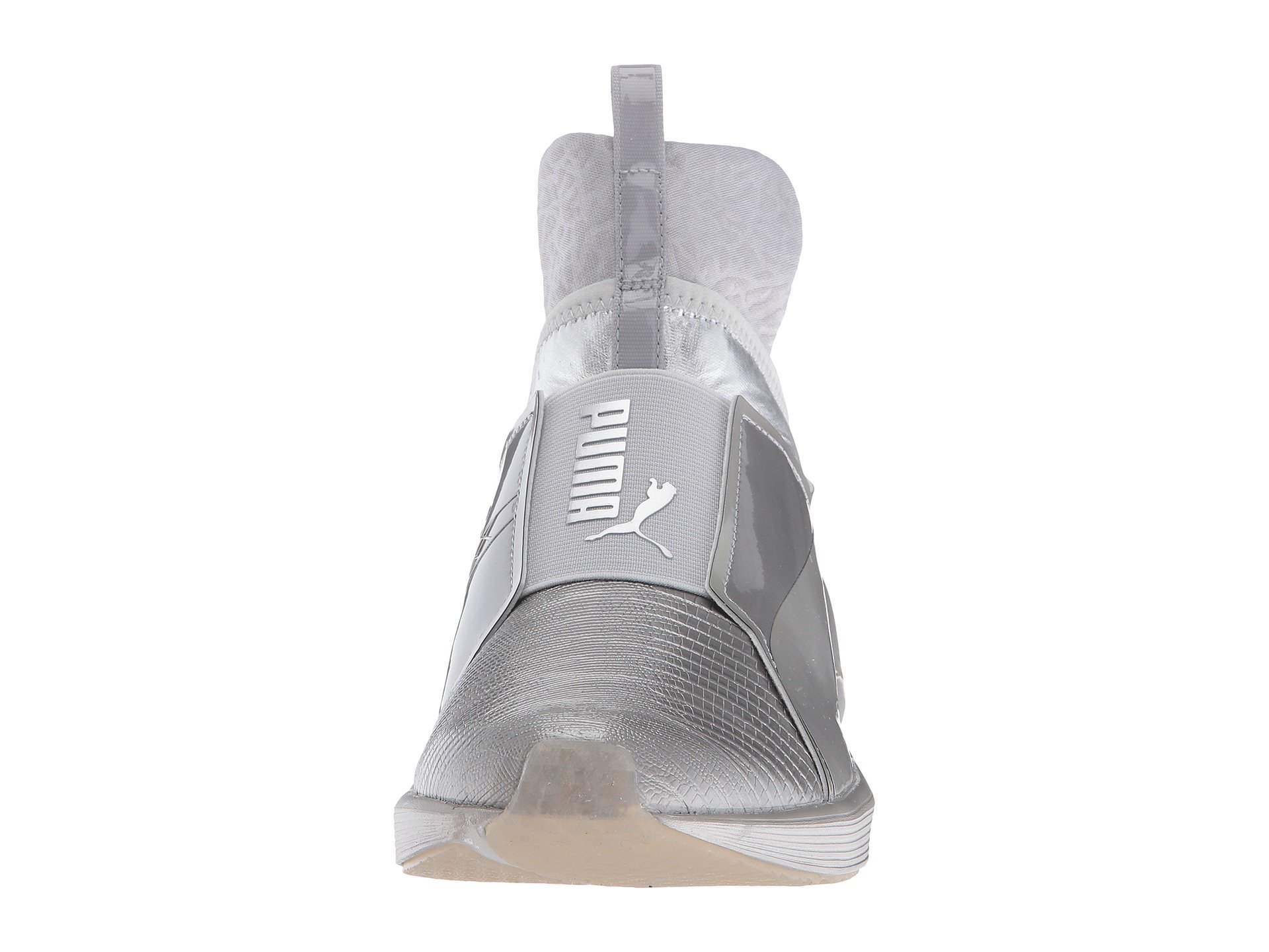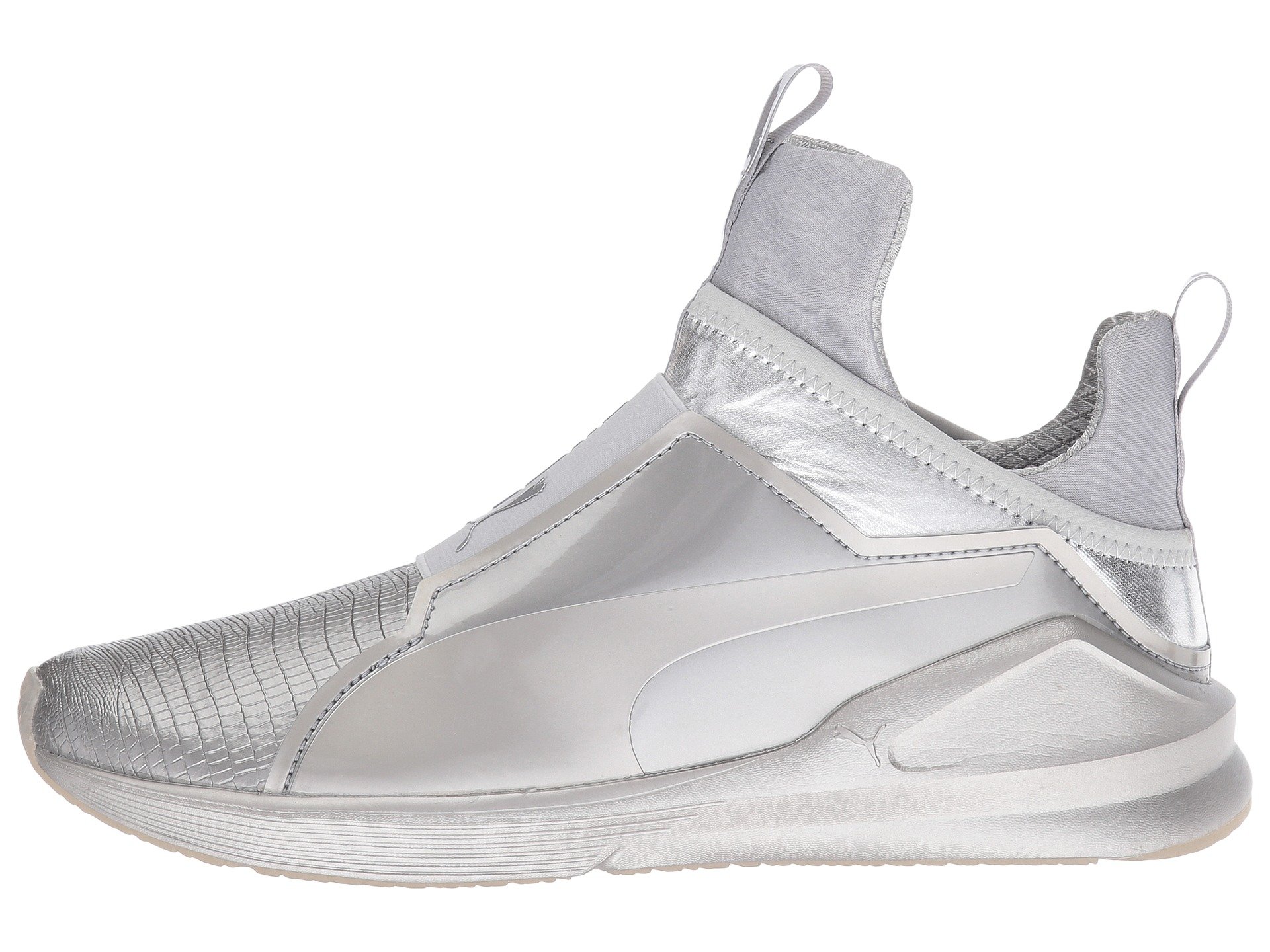 | Product Information SKU: #9024548PUMA?delivers a style that shines with the Fierce Metallic sneaker. Breathable mesh and synthetic uppers with a round toe.Slip-on bootie construction with pull-tabs at tongue and heel for an easy on and off.Extra-high tongue for added unique style.PUMA Cat Logo at medial side; PUMA Formstrip at lateral side.PUMA No. 1 Logo at midfoot.Breathable textile linings.Features internal flatlock stitching for reduced friction.Offers full-length flex grooves on outsole that provide dynamic multi-directional movement.Exaggerated thickness at heel, medial, and lateral sides for greater stability.Durable rubber outsole for added grip. Imported.Product measurements were taken using size 9, width B - Medium. Please note that measurements may vary by size.Weight of footwear is based on a single item, not a pair.Measurements: Weight: 8 oz |