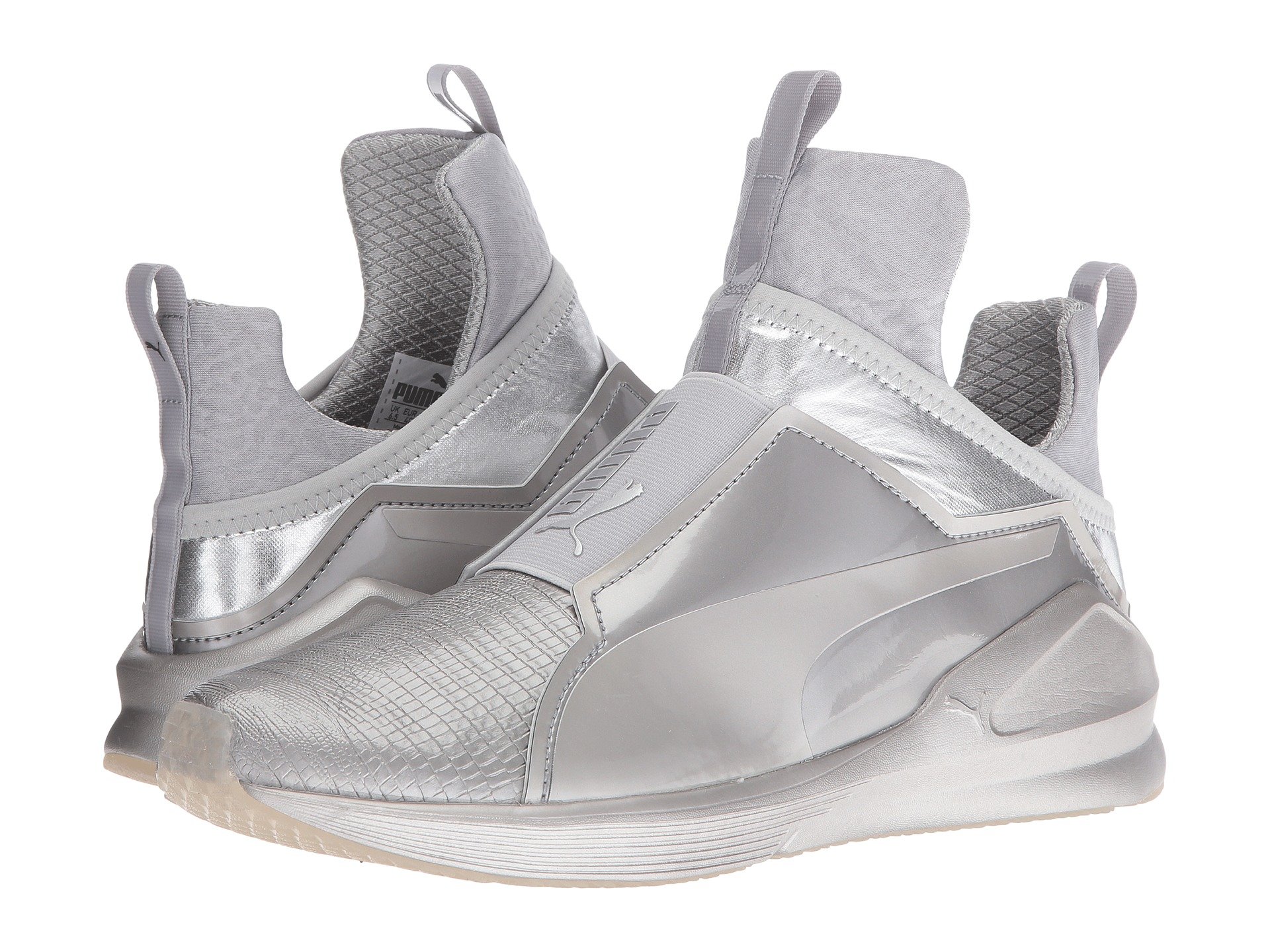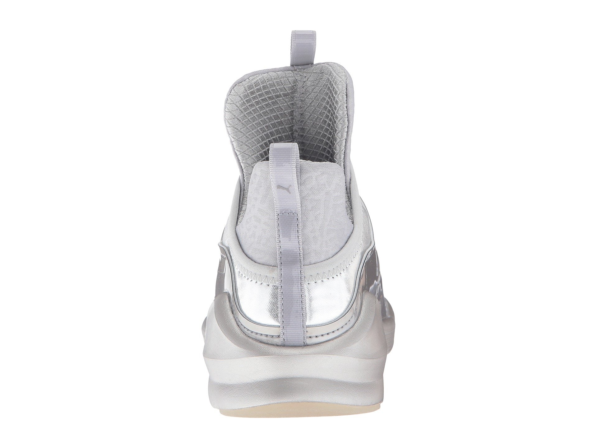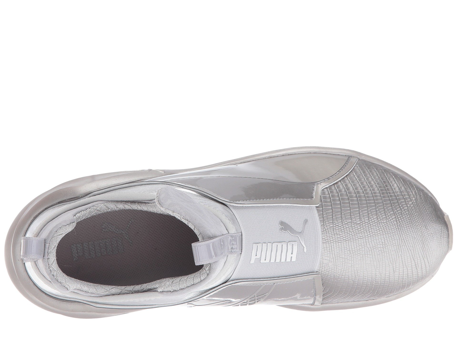 | Product Information SKU: #9024548PUMA?delivers a style that shines with the Fierce Metallic sneaker. Breathable mesh and synthetic uppers with a round toe.Slip-on bootie construction with pull-tabs at tongue and heel for an easy on and off.Extra-high tongue for added unique style.PUMA Cat Logo at medial side; PUMA Formstrip at lateral side.PUMA No. 1 Logo at midfoot.Breathable textile linings.Features internal flatlock stitching for reduced friction.Offers full-length flex grooves on outsole that provide dynamic multi-directional movement.Exaggerated thickness at heel, medial, and lateral sides for greater stability.Durable rubber outsole for added grip. Imported.Product measurements were taken using size 9, width B - Medium. Please note that measurements may vary by size.Weight of footwear is based on a single item, not a pair.Measurements: Weight: 8 oz |