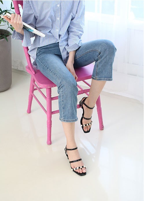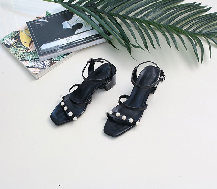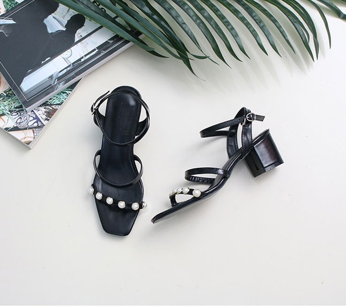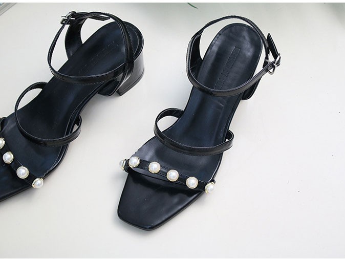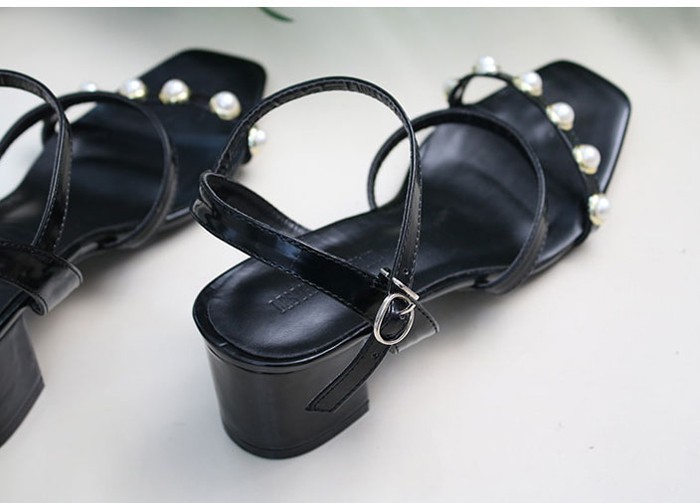 商品名:サンダル レディース チャンキーヒール 太ヒール アンクルストラップ パールビジュー 2018 夏 ファッション 靴 婦人靴