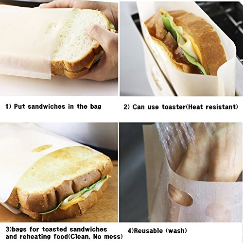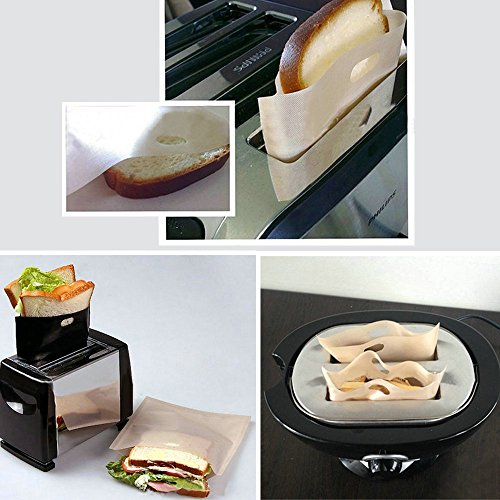 Product Description Features: Strong, non-stick, keep your toaster clean 6.6" x 7.5" - Large to accommodate almost any size bread Retain all the flavors and vitamins Keeps gluten free toasts gluten free - no cross contamination Great for traveling holidays - keeps your toasts clean gluten free Use in Toaster, Toaster Oven, Microwave, Grill, Oven Reheat snacks, pizzas, nuggets, vegetables and more in minutes! Reheat left-over food in a microwave with no mess! Easy to clean Reusable at least 100 times or more PTFE coated fiberglass and PTFO Free FDA approved Toaster bags are made from reusable food-standard PTFE-coated (Teflon) fiberglass sheets with non-stick surfaces on both sides. Bags make it easy to heat up your favorite foods while keeping you kitchen appliances clean and crumb free. Sandwiches, hamburgers, hot dogs, chicken, grilled cheese, vegetables, panini and garlic toast are just some of the foods you can reheat using these multi purpose bags. Toaster bags are reusable and can be washed in warm soapy water or in the dishwasher. Set of 6 Toaster Bags Thickness: 0.07mm Temperature Resistance: up to 500 °F Standard size: 6 ⅔ "x 7 ½ " (17x19cm) Color: beige Perfect for Gluten Free Diet Food Allergies Bread slices do not touch toaster Toast never picks up gluten remnants No cross contamination Grab a Set today! 0