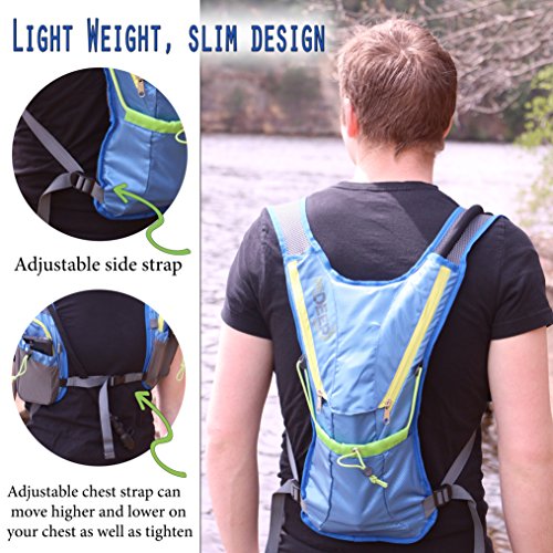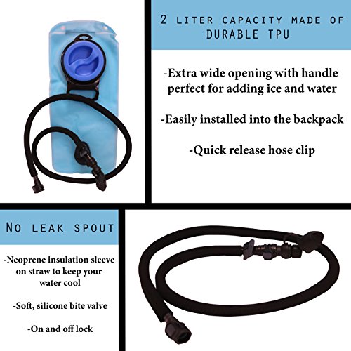 HYDRATION BLADDER INCLUDED: Wide mouth 2 LITER / BPA-free food grade water bladder bag and bite tube included. Tube has an insulated hose with bite valve, and an on/off valve with cap to prevent spills. The large water filling opening makes it easy to fill with water and ice cubes. Secure bite tube can be fed through the right or left side and secure on the strap.