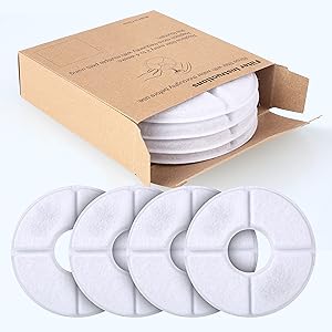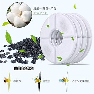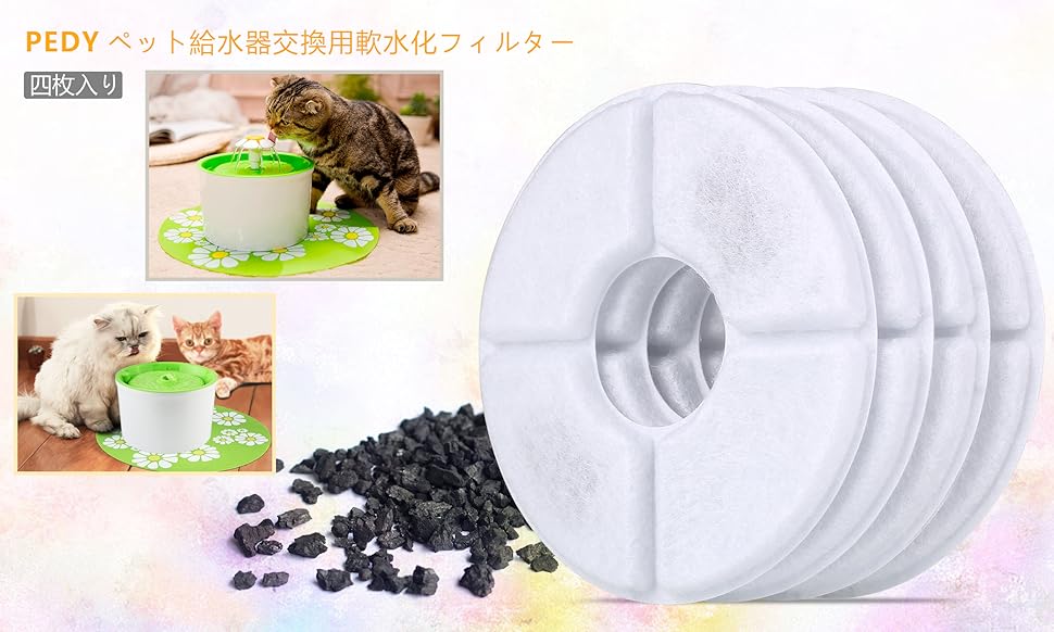 サイズ:幅12.7 ×幅12.7 ×高さ2cm セット:4枚付き ご注意: 本来の目的以外の使用はご遠慮ください。 保管する時、ペット・子供の手の届かないところに置いておいてください。 | 使用方法:軟水化フィルターの不織布のほうを上側に向けて取り付けてください。 | 使用期間:いつも水を爽やかに維持するため、2~4週間に1回でフィルターを取り替えるのははおすすめです。そして、明らかな汚れがついた時も、取り替えてください。 また、ペットが複数をもつ方はより高い頻度で交換してください。 |