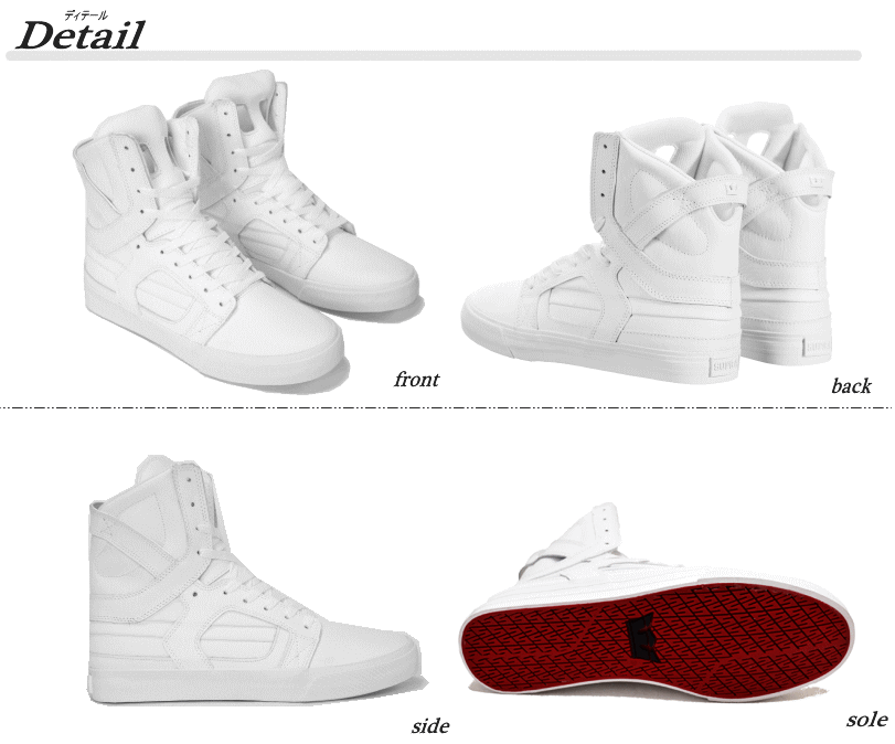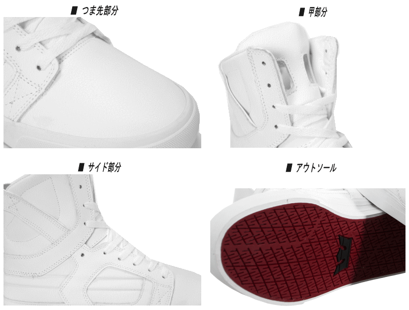 | 商品説明 | <BRAND STORY> 2006年、アメリカのカリフォルニアで誕生したスニーカーブランド。その斬新なデザイン、高い機能からリアルスケーターはもちろんのこと、数々のラッパー、DJ、アーティスト、NBAプレイヤーなど、セレブ達がこぞって愛用している事でも有名である。 <ITEM INFO> ・SUPRAの中でも特に人気の高いモデル「SKYTOP」をさらにハイカットに進化させアップデートさせ「SKYTOP2」。近未来を感じさせる独特なシルエットが特徴的。 ▼ SUPRA製品について ▼- 必ずお読み下さい - SUPRA製品は、ブランドの特製上、ファッション性を強く意識しているが為、物によって作りが荒い物もあります。ブランド志向が強く、細部のクオリティーまでこだわる方には、あまりオススメ出来ません。縫製が荒い物、接着剤のはみ出し、アッパーの多少の汚れ、靴ヒモへの色移り、スウェードの擦れ、インソールの浮きやズレ、品質にムラがある場合が御座います。これらは、SUPRAブランドの製品の特性上の事ですので、予め、ご了承の上、お買い求め下さい。 |