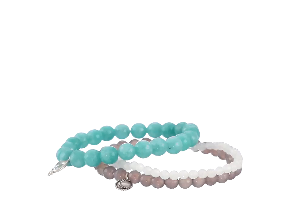 Adorn your wrist with three bracelets featuring white jade, gray agate, and angelite beads with small aquamarine and sterling silver charms for stacked or individual wear.
